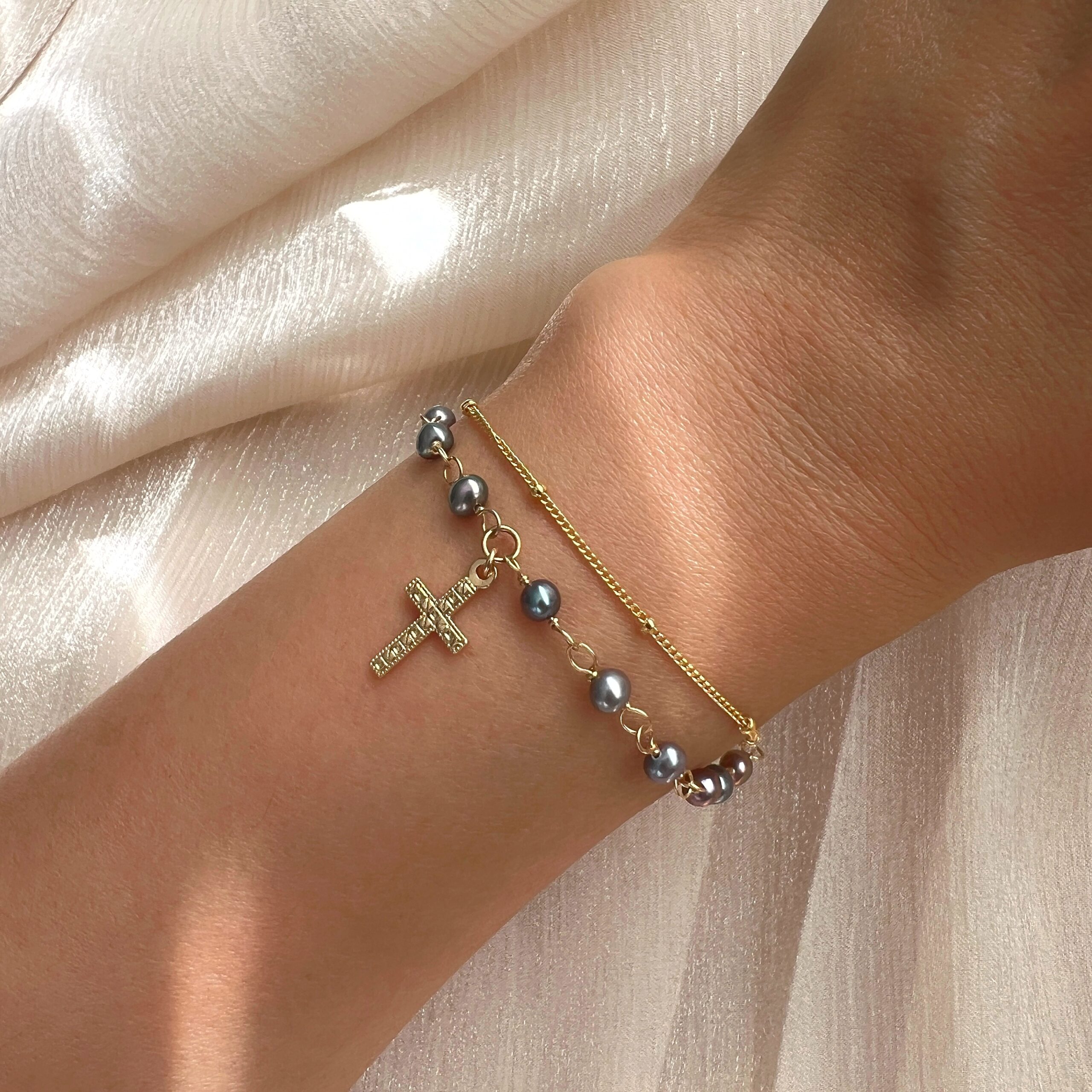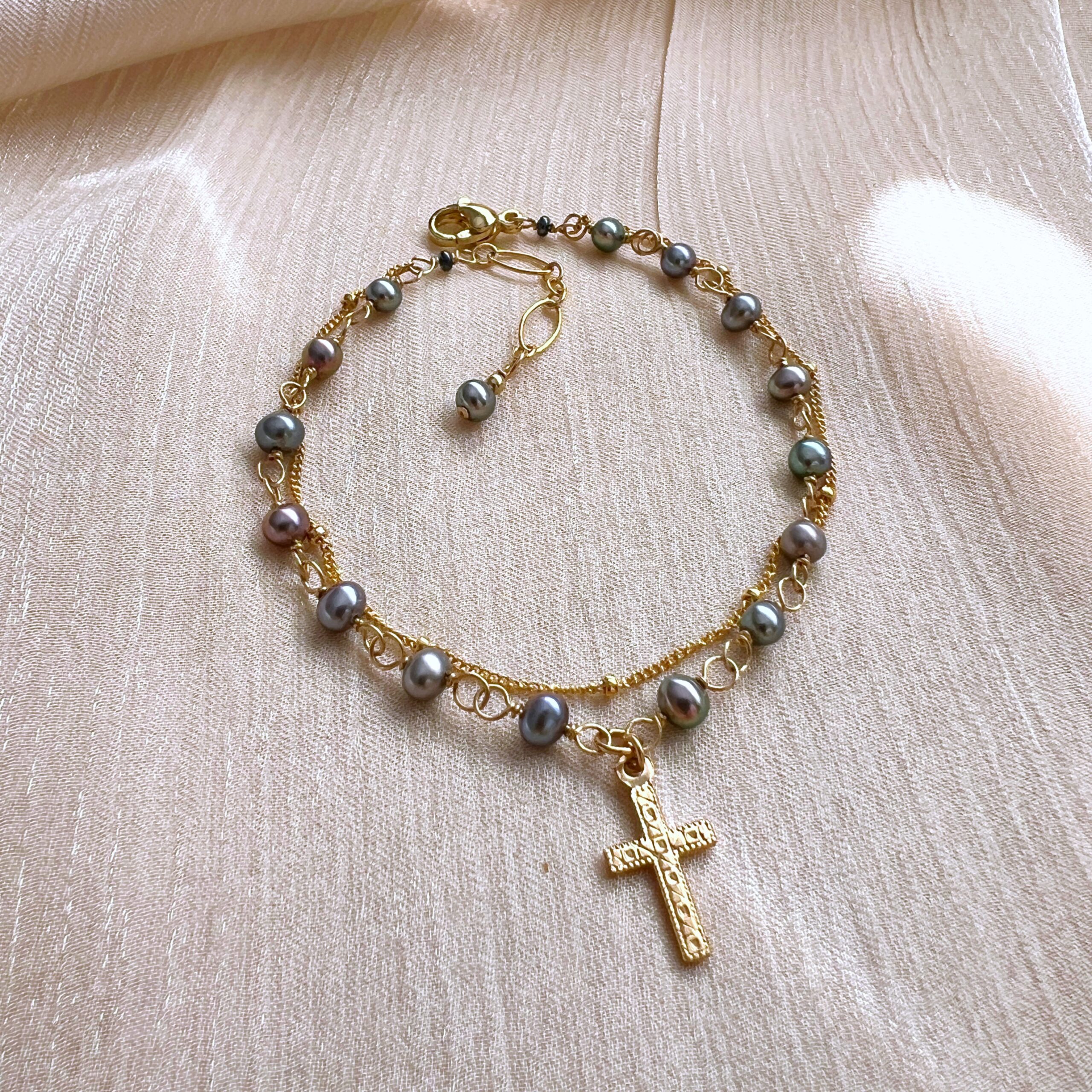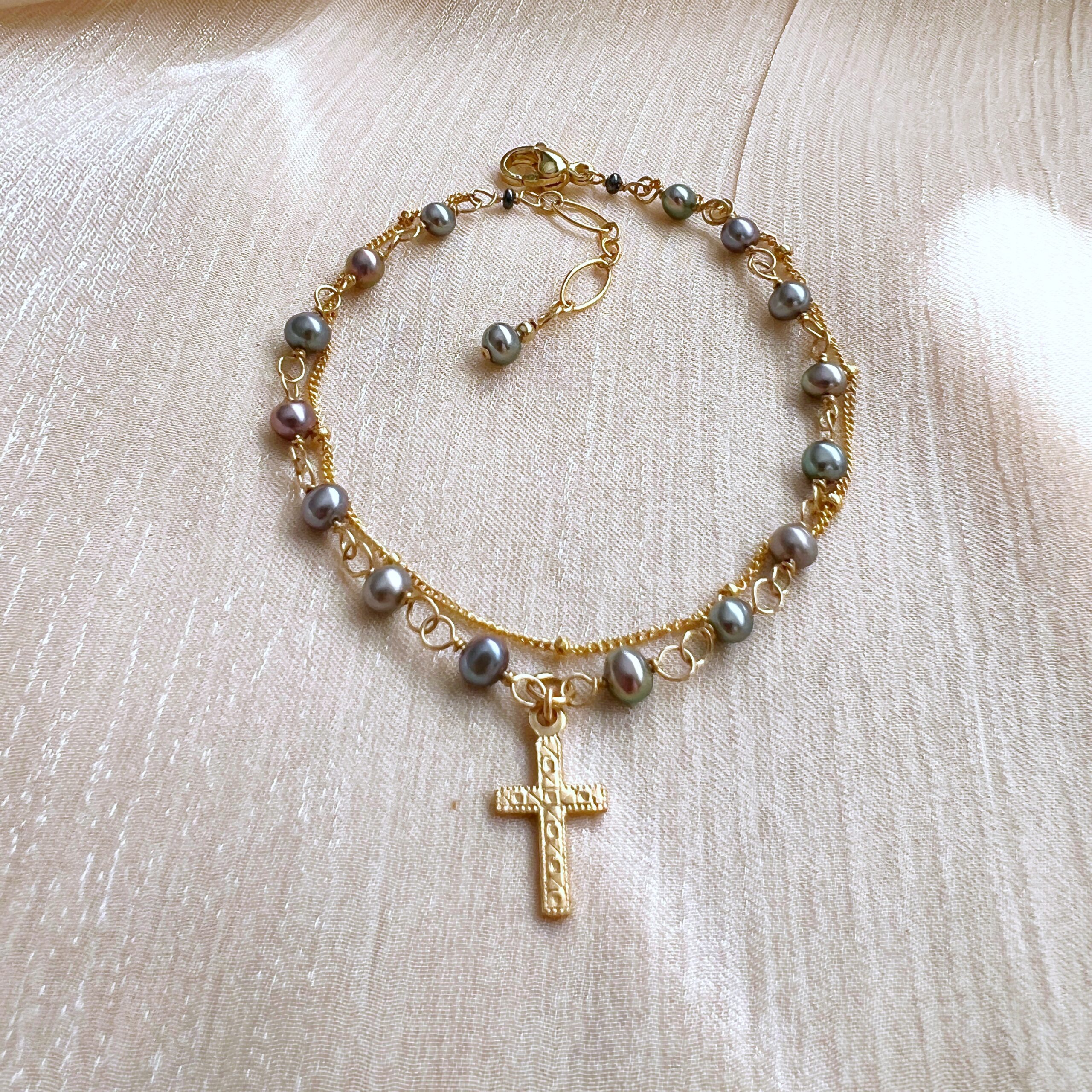 Be the first to review “Iridescent pearl rosary double strand bracelet”