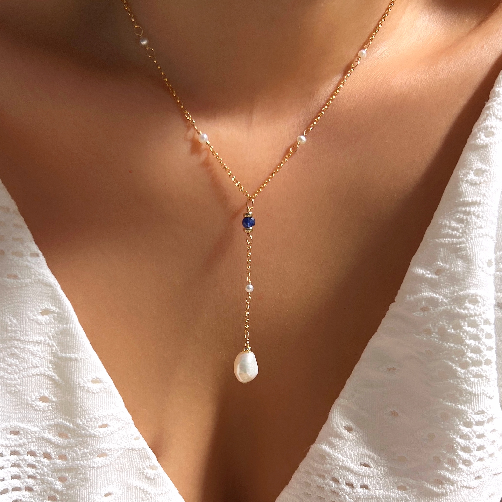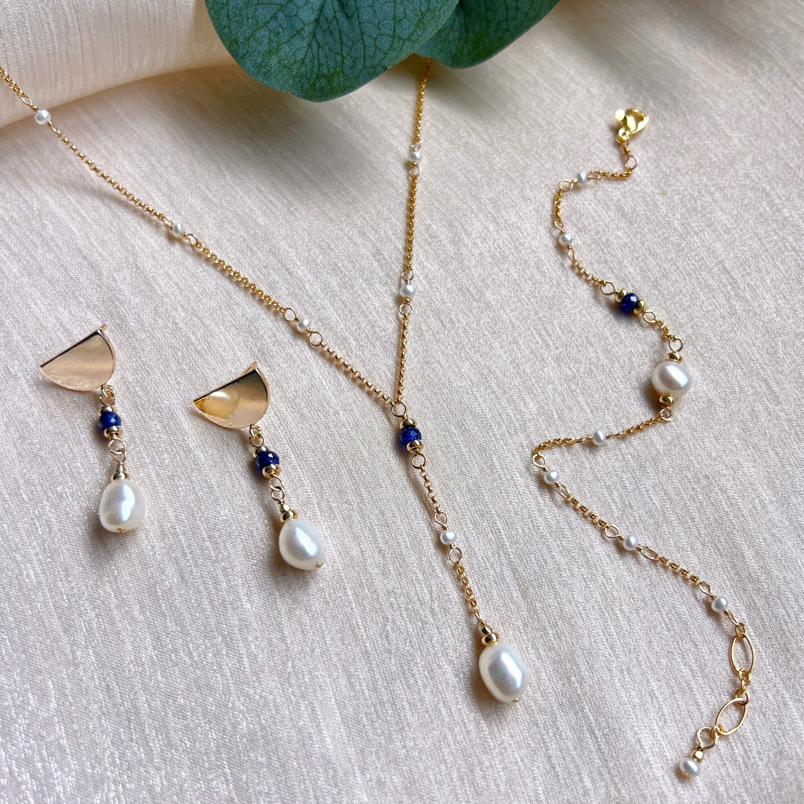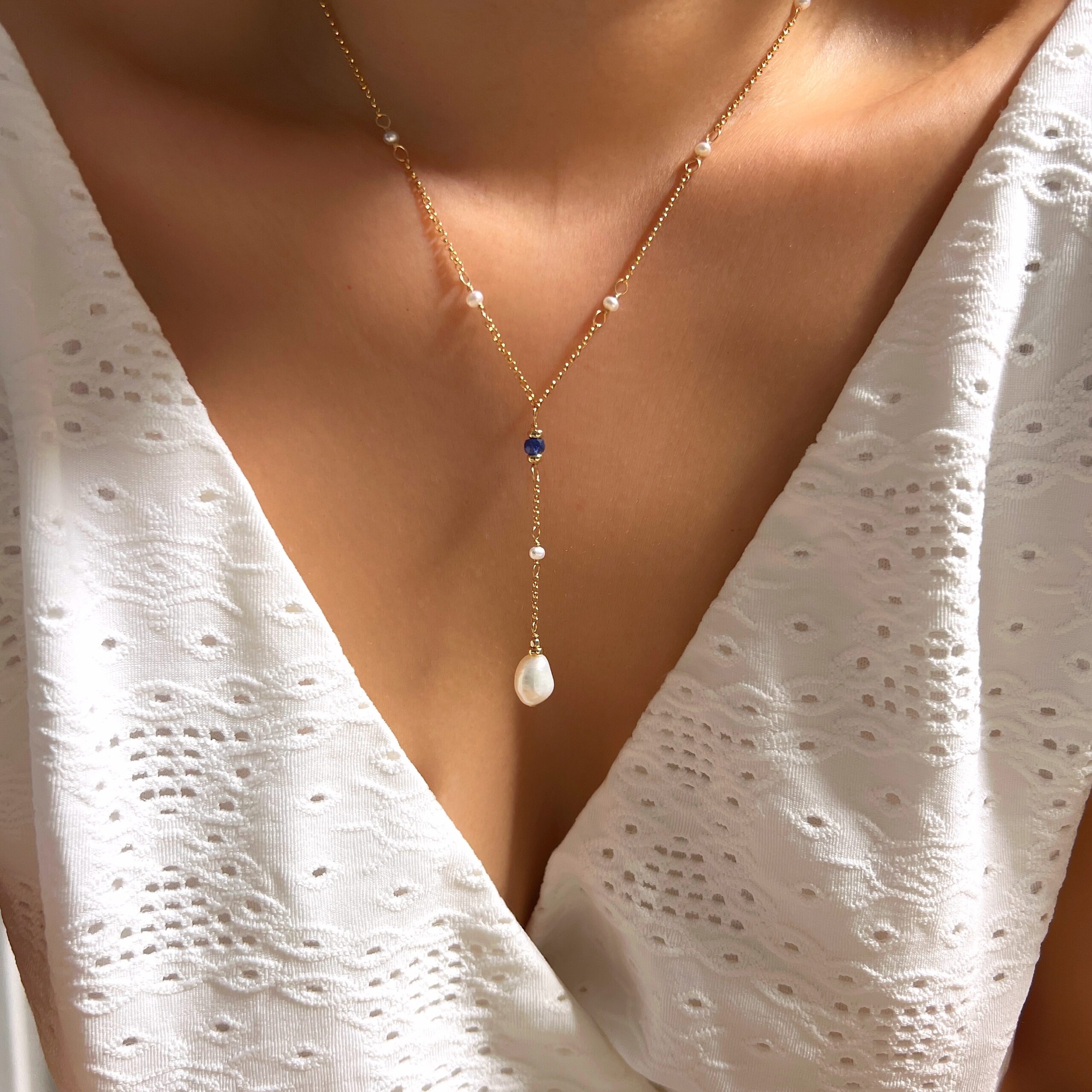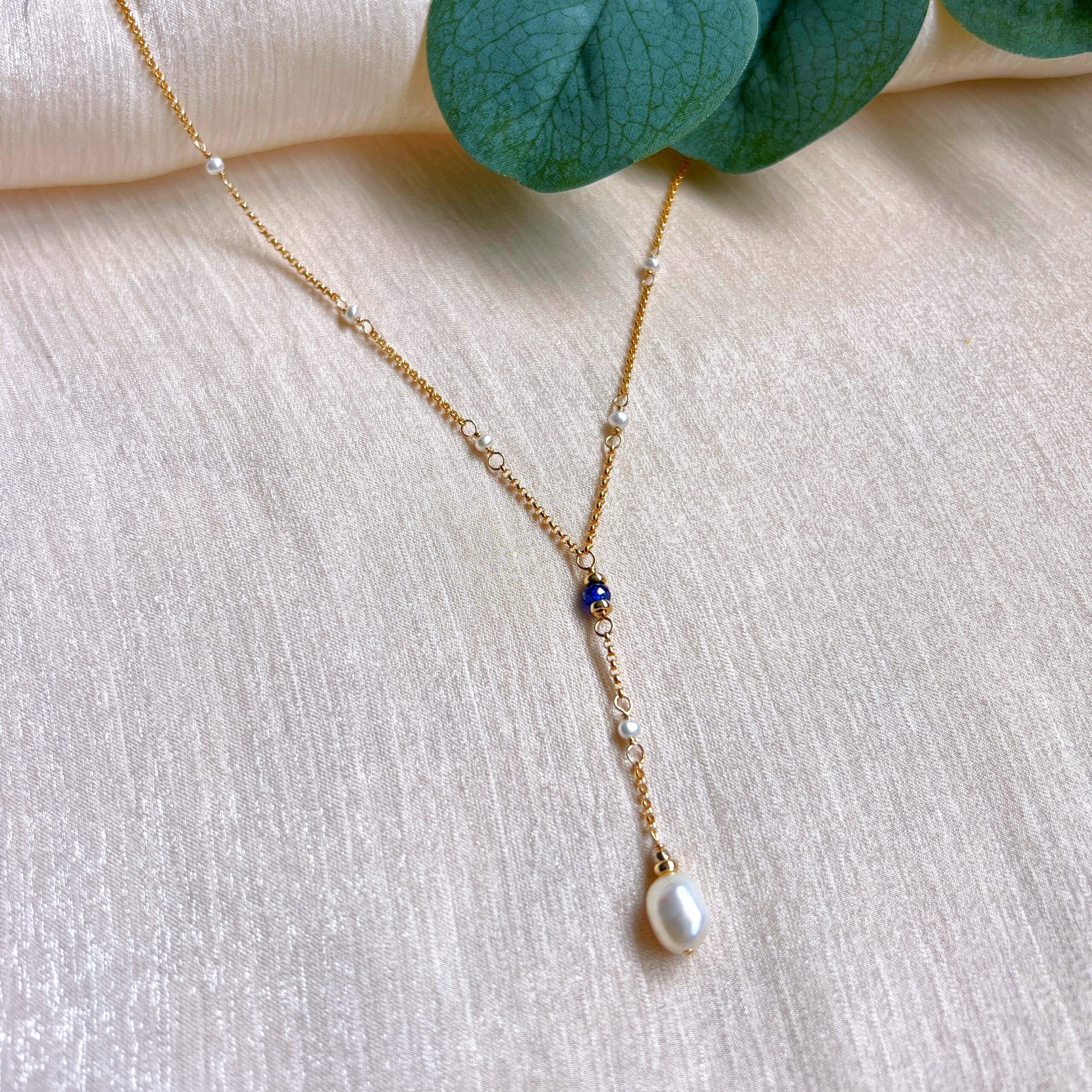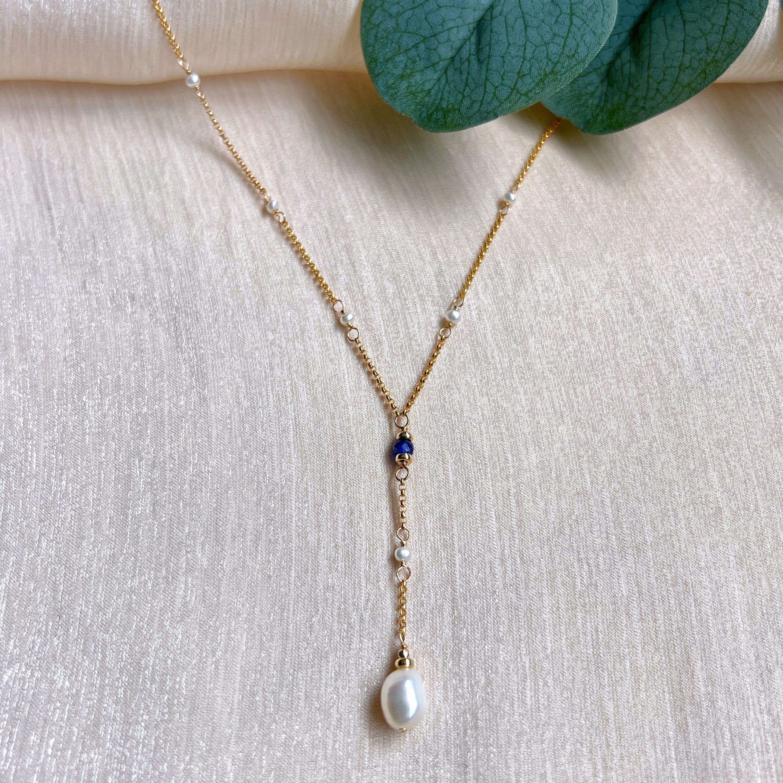 Be the first to review “Sapphire and baroque pearl dangle necklace”